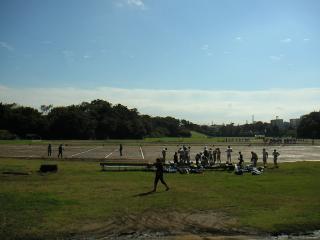 どうも練習中に選手が怪我をしたようです。よく見ると、グランドの中にひとり、倒れていましたが、幸い、腕の怪我で済んだようです。