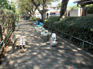 | 住宅街に沿って歩道が整備されていて、幼児の遊び道具になるモニュメントが沢山おかれています。 |