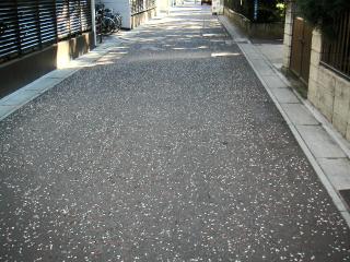 | お堂の前の歩道は、桜吹雪をあしらったアスファルトです。 |