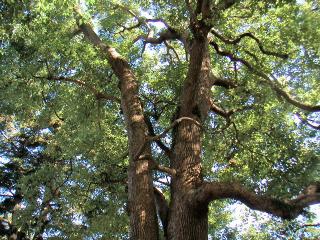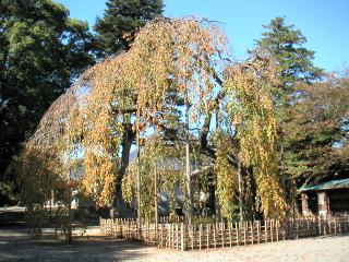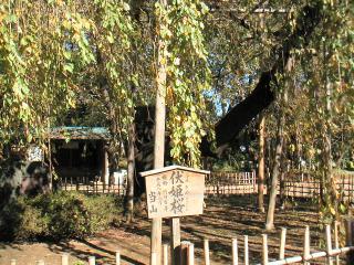| この木は、「伏姫桜」という立派な桜の木です。横に長く幹が伸びていて、支えなくしては立っていられない姿見です。 |