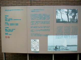 手賀沼公園の入り口には、我孫子市のおしゃれな公民館が建っていて、生涯学習コーナーなどが盛況な様子でした。館内には、手賀沼の歴史を紹介する展示などもあります。左は、入り口の看板です。 |