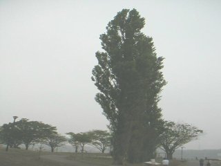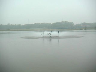 | 手賀沼の丁度真ん中あたりに、水質浄化のための噴水が設置されています。湖水を湖岸から吸い込んで浄化してポンプで噴出す仕組みです。どの程度、効果があるか、よく知りませんが、近年、少しずつではあるが、水質改善が進みつつあるようです。 |