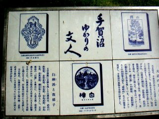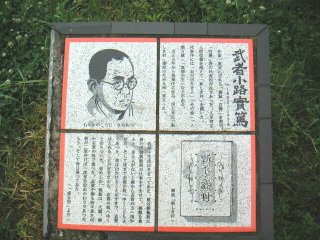 | 手賀沼には、明治の白樺派の文人たちが数多く住んでいたのですね。これは、武者小路実篤を紹介する石版です。武者小路実篤は3年ほど、この手賀沼の近くに住んでいたそうです。 |