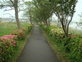 湖岸の周囲を取り巻くように、こんな遊歩道が整備されています。丁度、つつじが咲き始めた頃合で、両側を延々とつつじに囲まれてのウォーキングは快適です。
