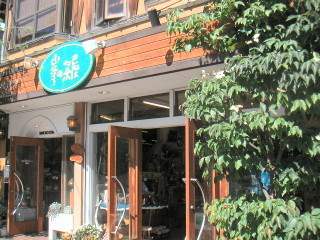 | みんなの希望で、まずは、観光案内所前の湖畔の「峰の茶屋」へ。手作りの木工品などに、稔が品定めをしたようです。 |