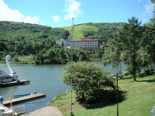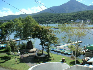 三日目は、台風一過、快晴に恵まれ、格好のドライブ日和です。ここは、白樺湖の観光案内所の前の駐車場です。 |